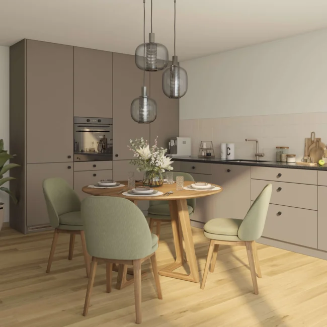 Die hochwertige und moderne Ausstattung in den Nasszellen sowie in den Küchen sorgt für ein ansprechendes und komfortables zuhause. Der gesamte Innenausbau wird in einem modernen, zeitlosen Standard realisiert. Jede Wohnung verfügt über eine eigene Waschmaschine und einen eigenen Tumbler. Zusätzlich steht jeder Einheit ein separates Kellerabteil zur Verfügung, das zusätzlichen Stauraum bietet.