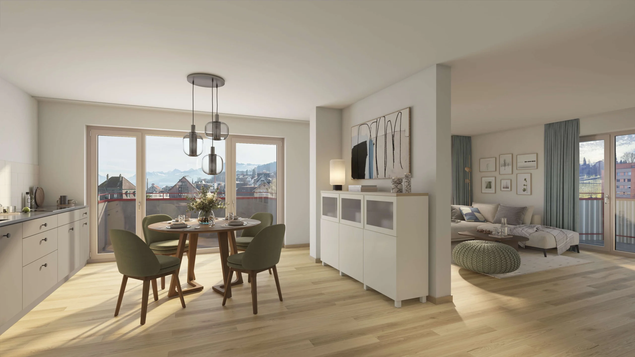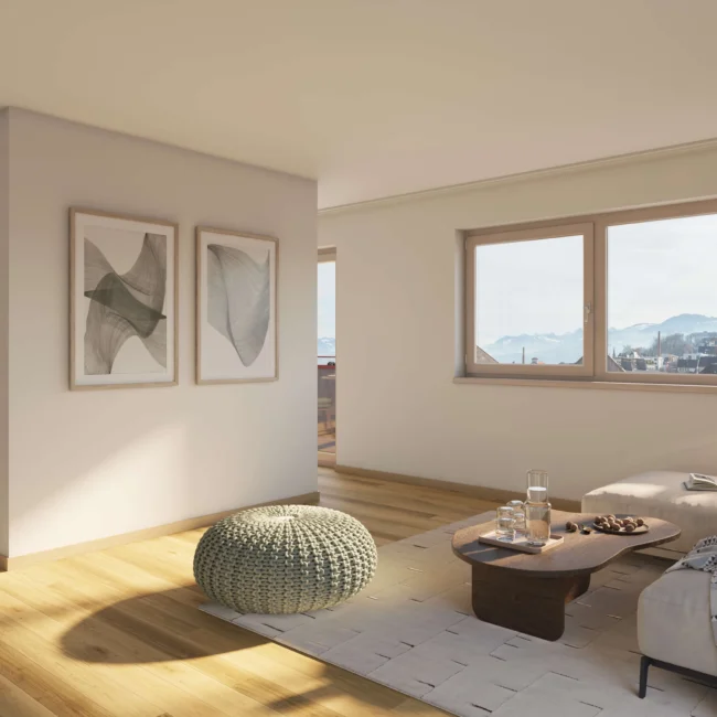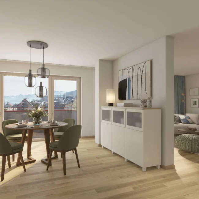 Dank der erhöhten Lage geniessen ausgewählte Wohnungen eine be­eindruckende Sicht über den Zürichsee. Besonders die oberen Wohnungen profitieren von grosszügigen Terrassen, die den Wohnraum nach aussen erweitern und den Ausblick zum täglichen Begleiter machen. Aber auch die übrigen Geschosse überzeugen mit hellen, klar strukturierten Räumen und durchdachten Grundrissen.
